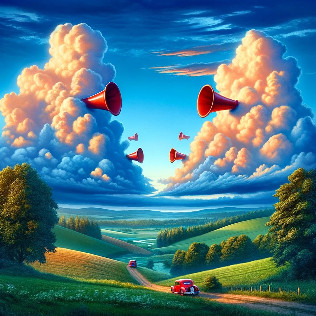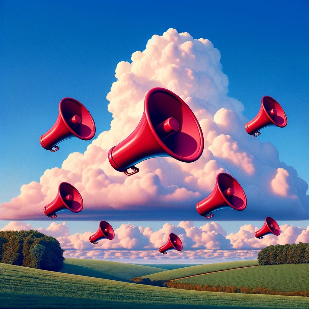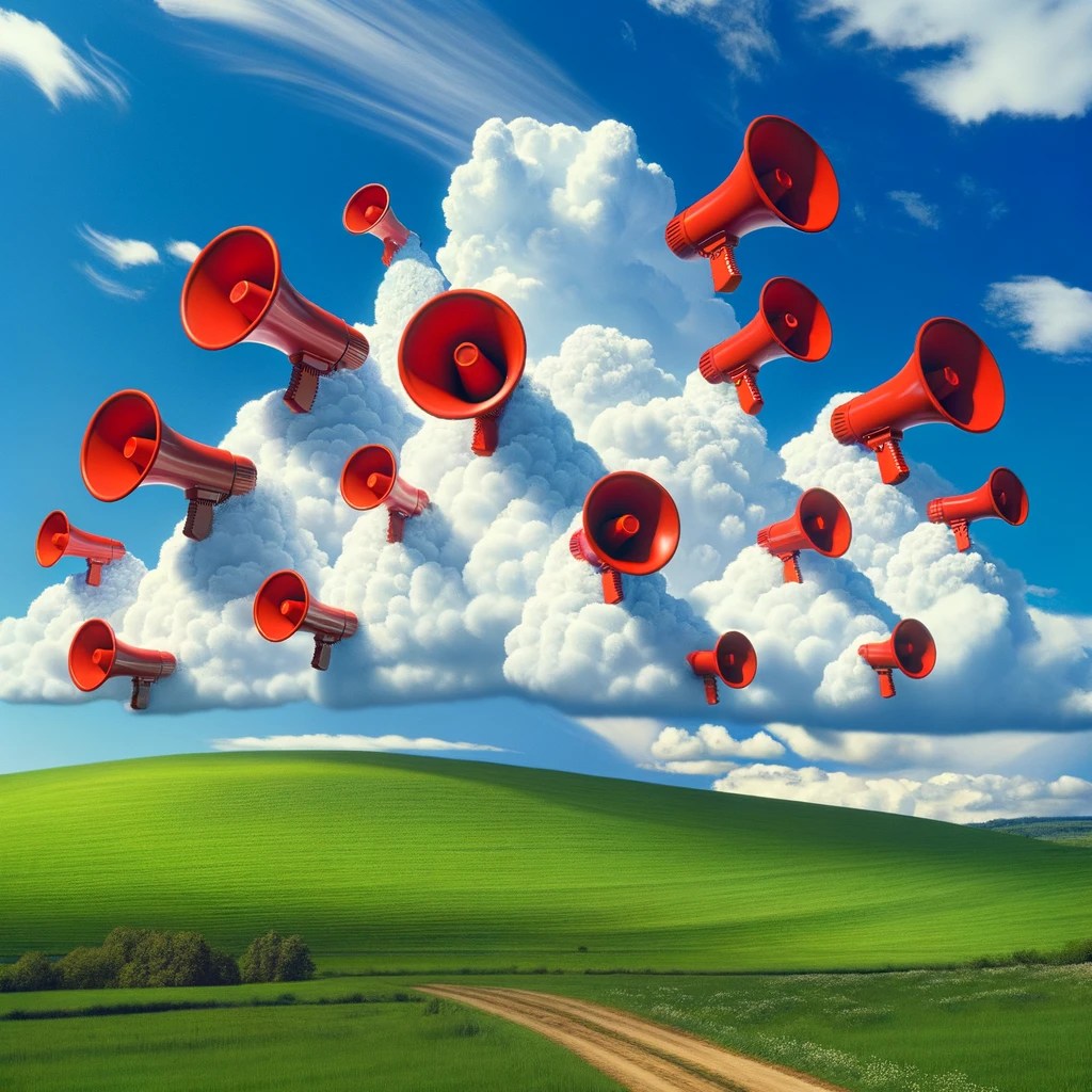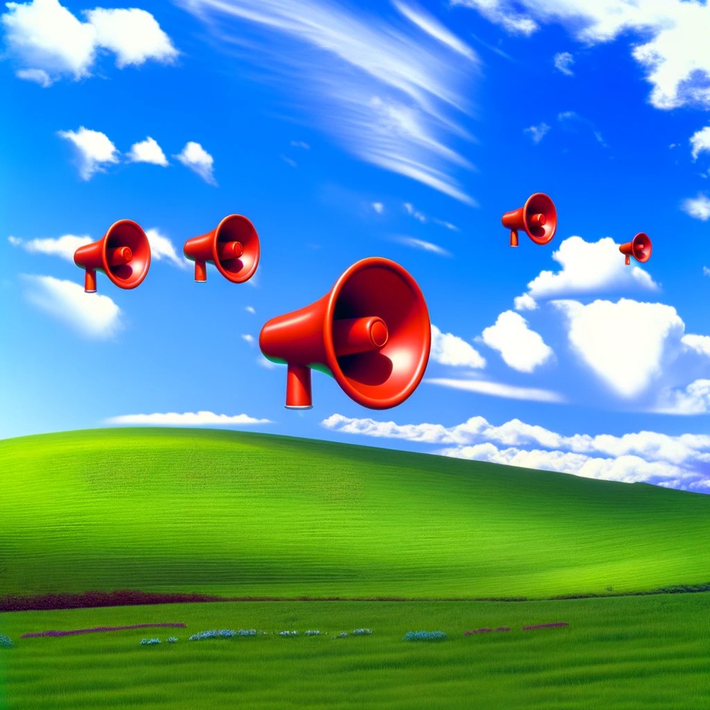 ChatGPT aka DALL-E: Certainly! The iconic default background of Windows XP is known as “Bliss”, which features a bright blue sky with fluffy white clouds over a green hill. I’ll create a rendition of this with the addition of large red megaphones flying in the air.