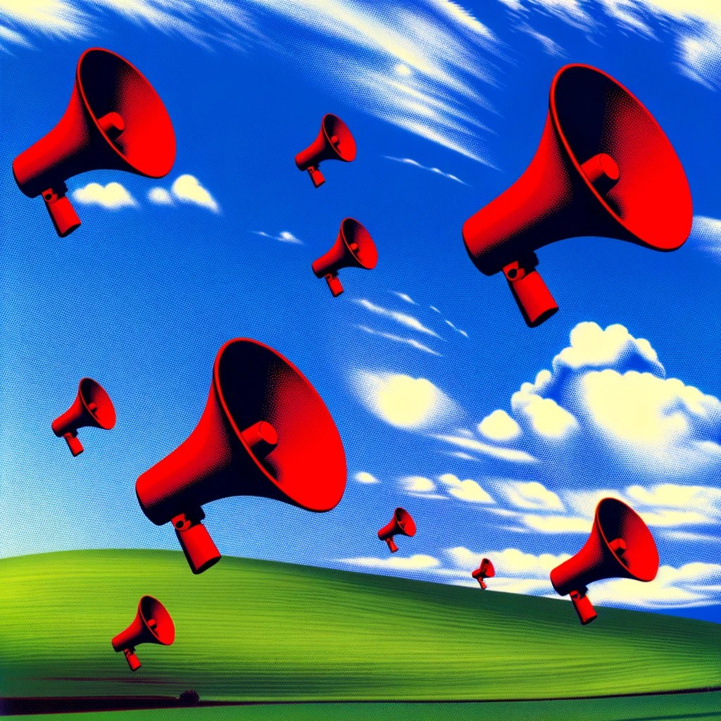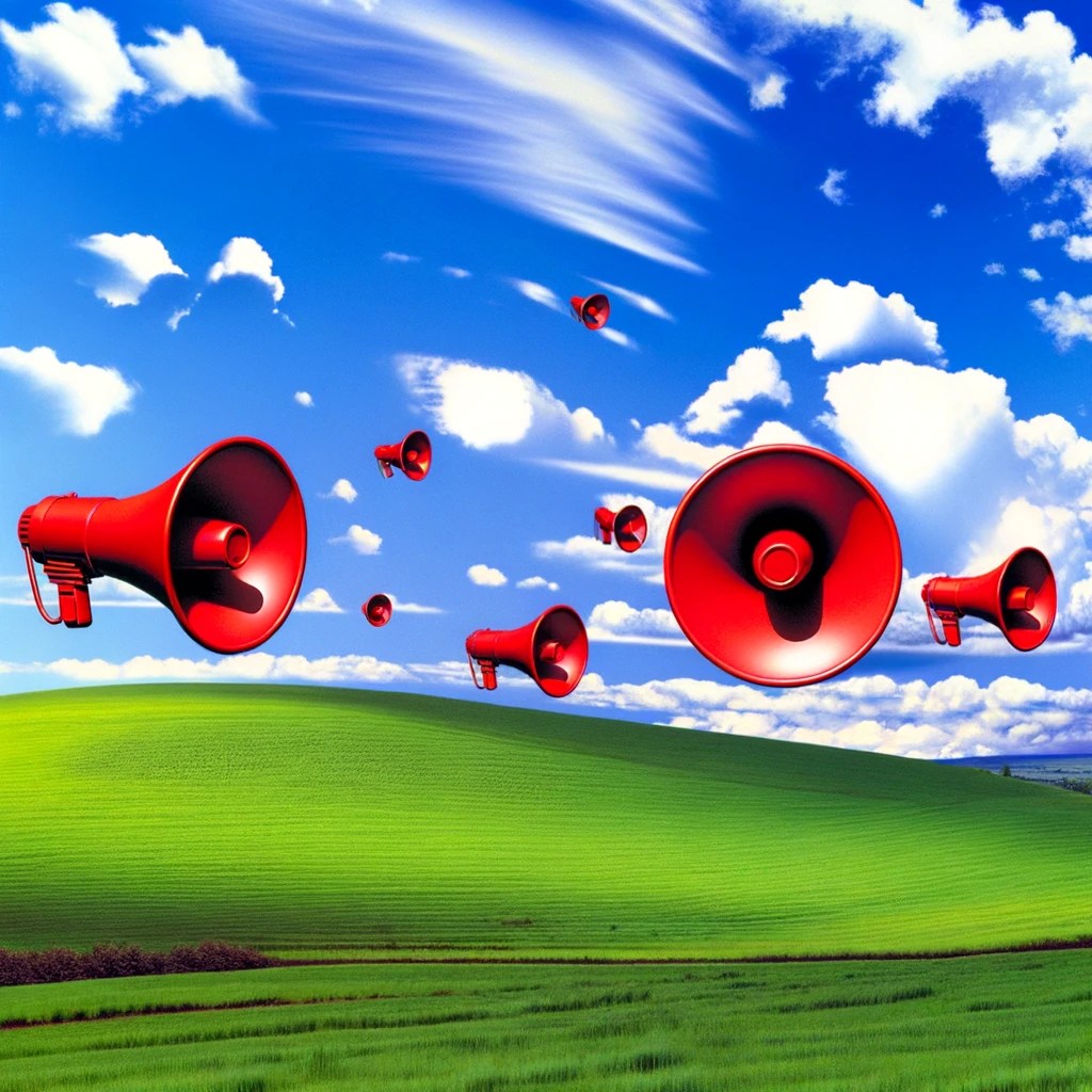 Me: Create a photo that resembles the default background image that Windows XP used to have, except that large red megaphones are flying in the air.