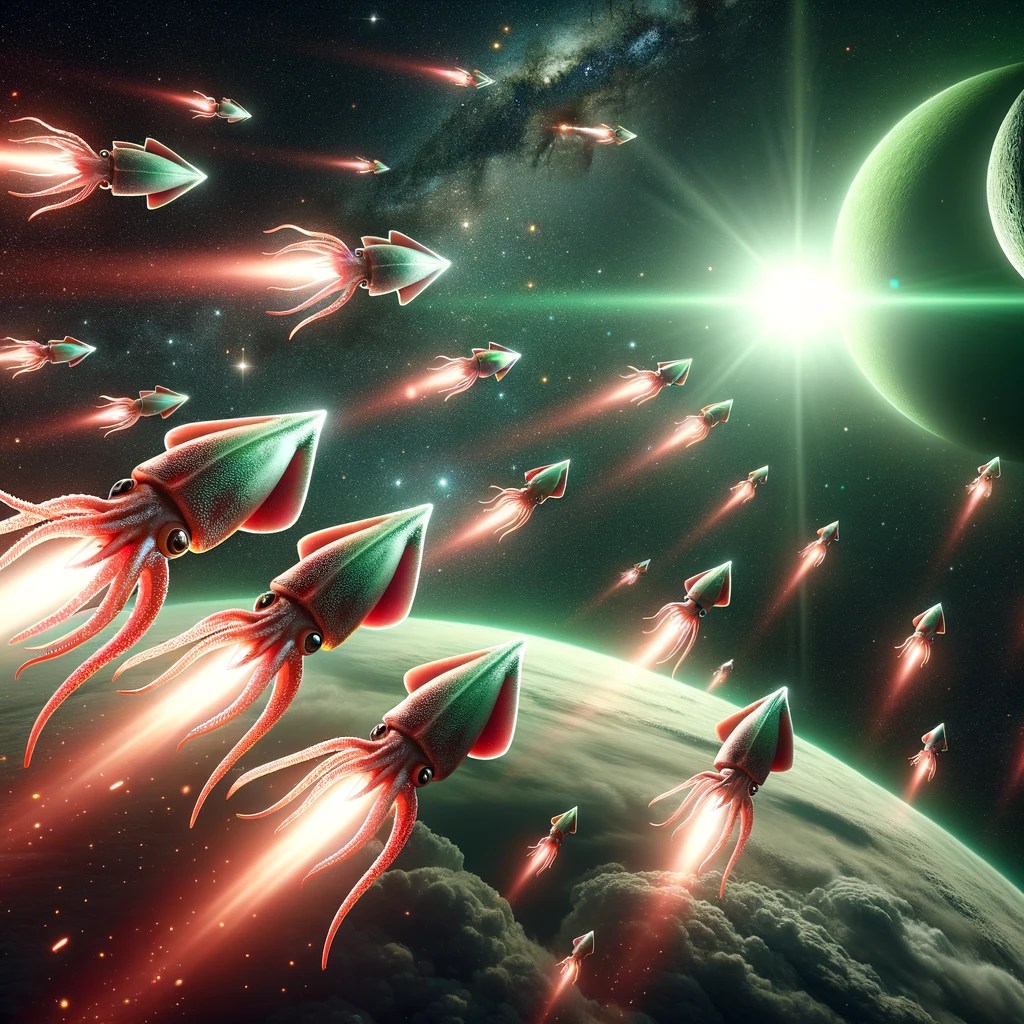 Me: Create a photo of a squadron of snails flying through space towards a green moon. The light of a sun should come from the top right but the sun itself must not be visible on the image. Make the shells of the snails glow in bright red.