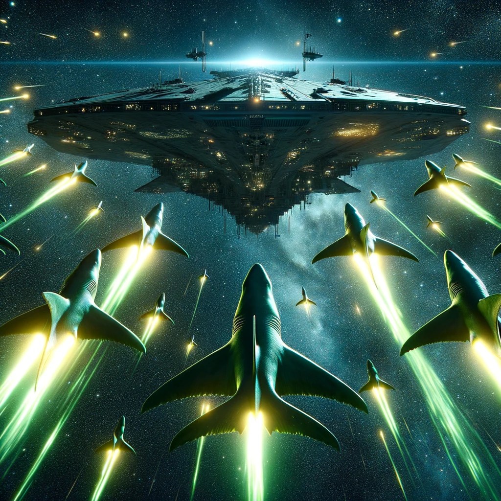 Me: Create a photo that depicts a squadron of sharks flying through space. Make the sharks attack an Imperial Star Destroyer like in Star Wars. The sharks glow in bright green.