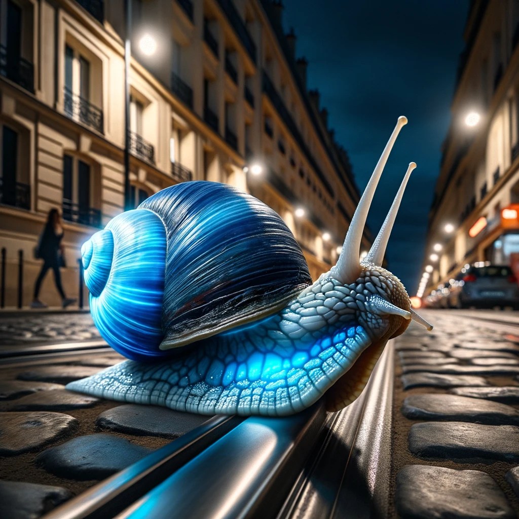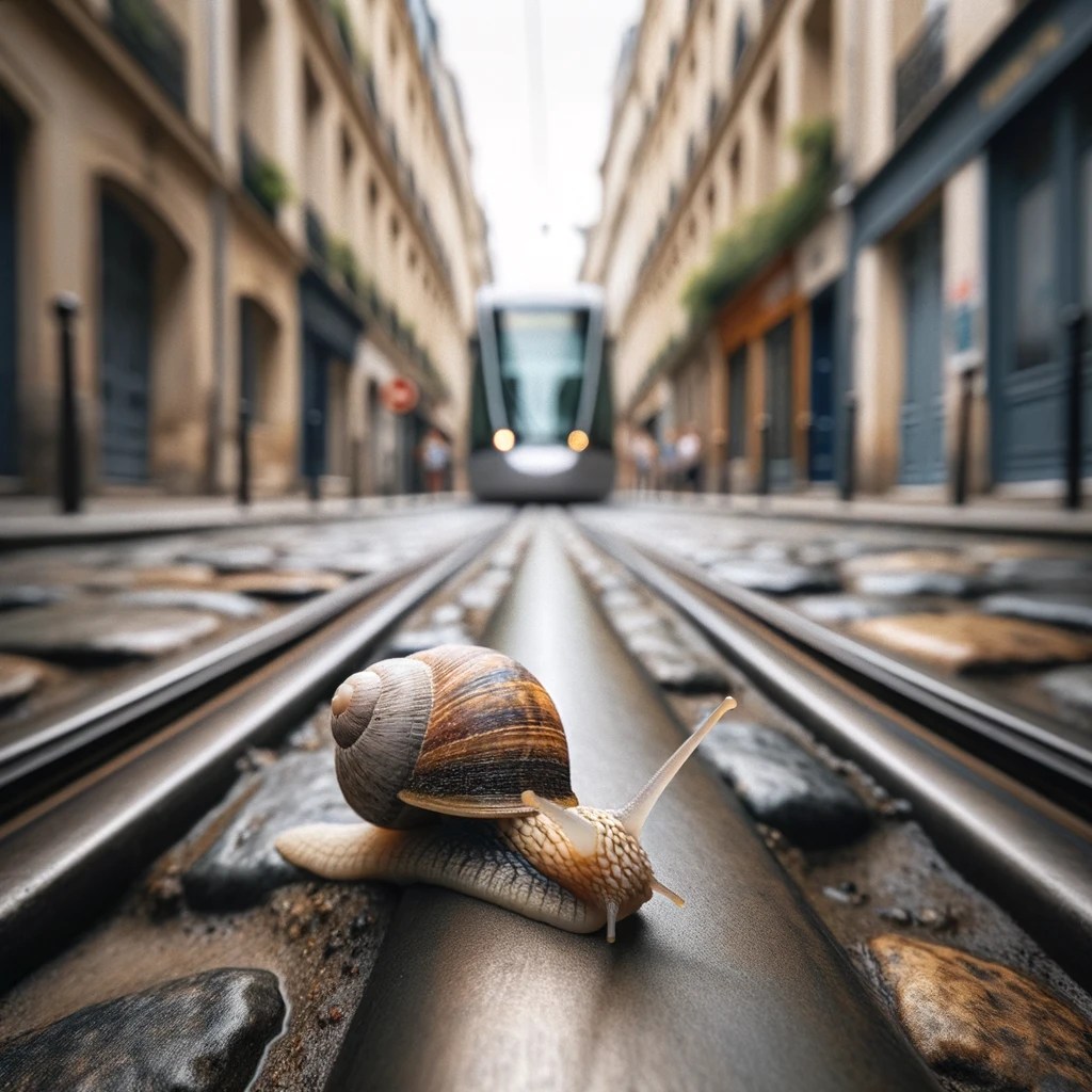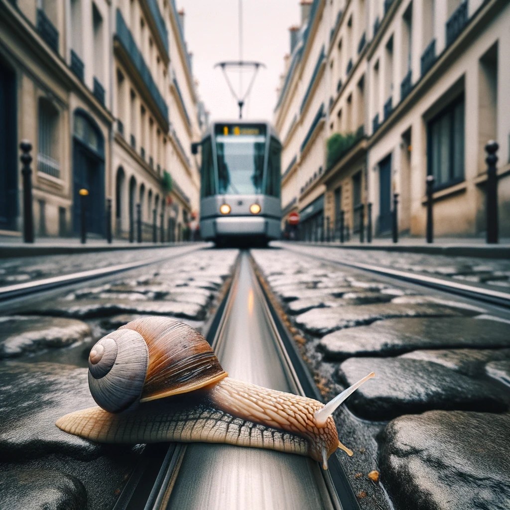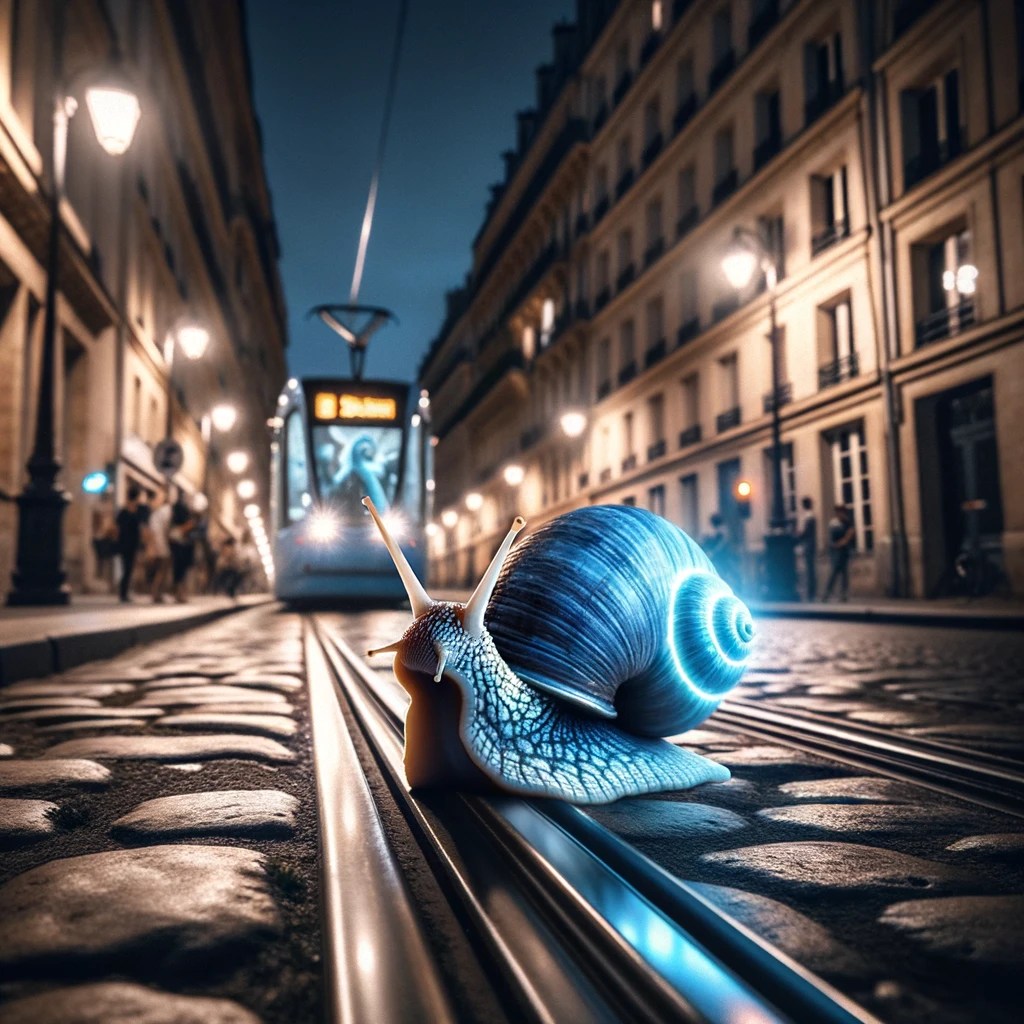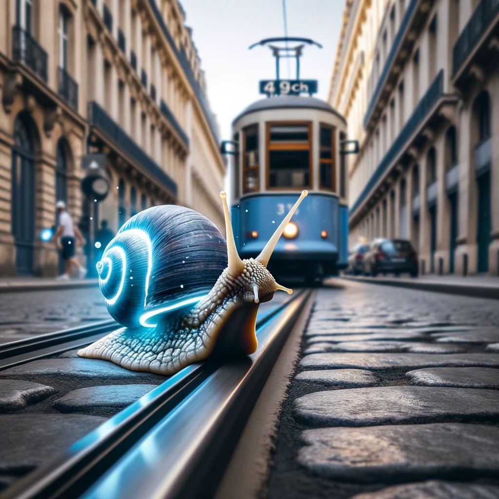 Me: Create a photo of the close-up of a snail inching ahead on a tram track. The tram track is in a narrow city street. The street is covered with cobblestones. The buildings resemble 1960s Paris. A tram is approaching in a distance. Keep the snail in a closeup.