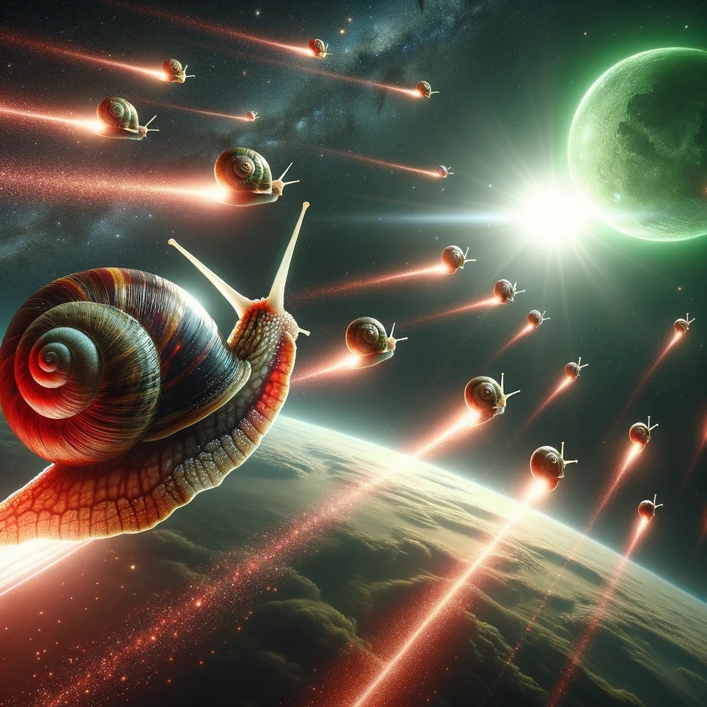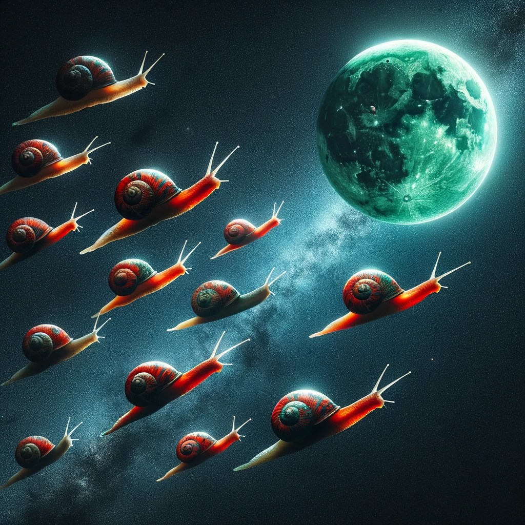 Me: Create a photo of a squadron of snails flying through space towards a green moon. The light of a sun should come from the top right but the sun itself must not be visible on the image. Make the shells of the snails glow in bright red.
