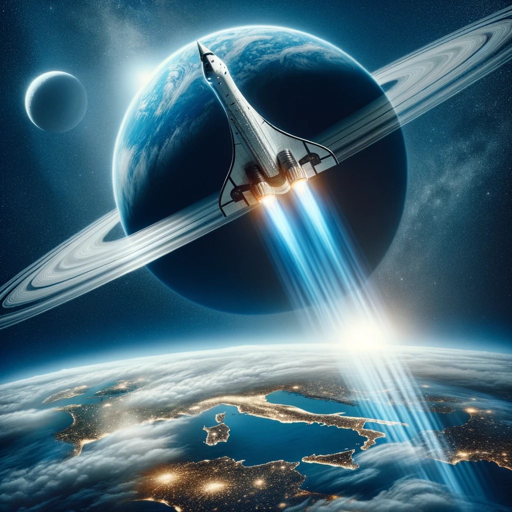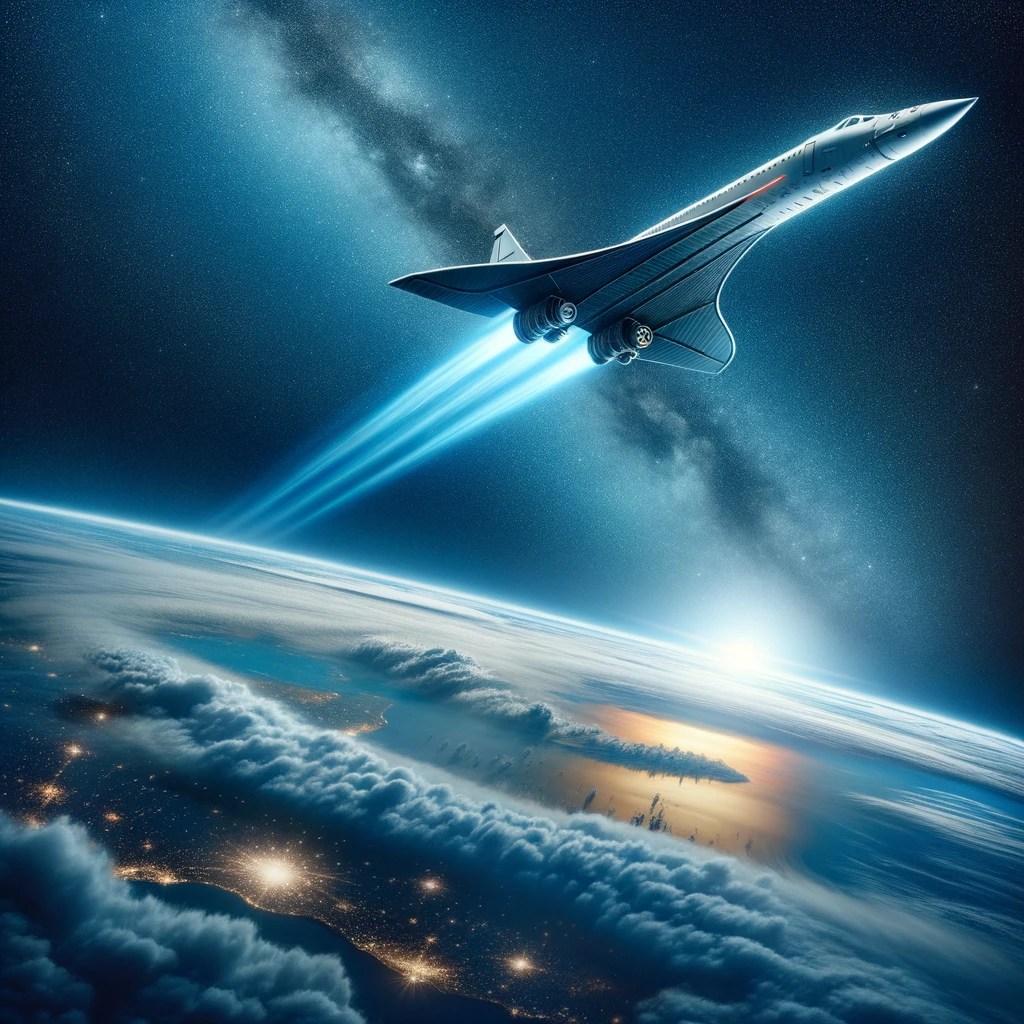 Me: Create a new image that has a spaceship resembling the Concorde, slowly leaving the atmosphere of Earth.