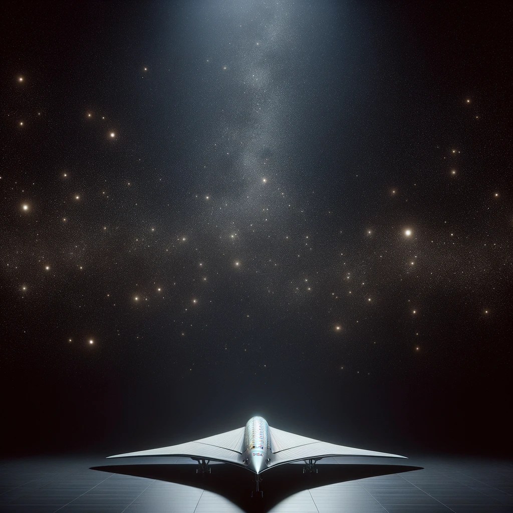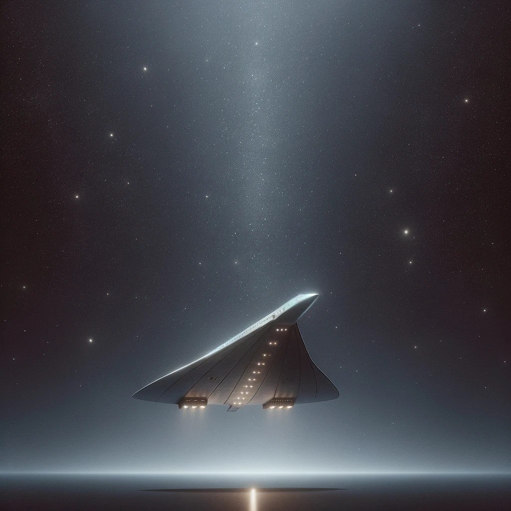 Me: Create a photo of a single spaceship resembling the Concorde in deep space. Put just a few stars in the backdrop. Light should come in the picture from the bottom left.