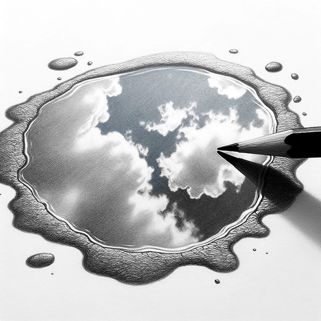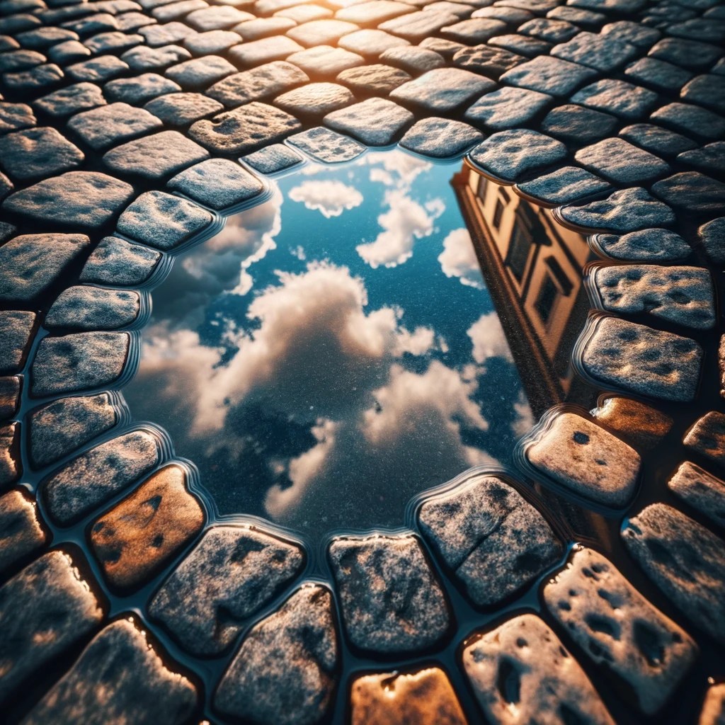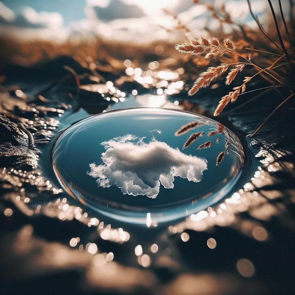 Me: Create a photo of a close-up of a puddle that reflects the clear sky with a few clouds.
