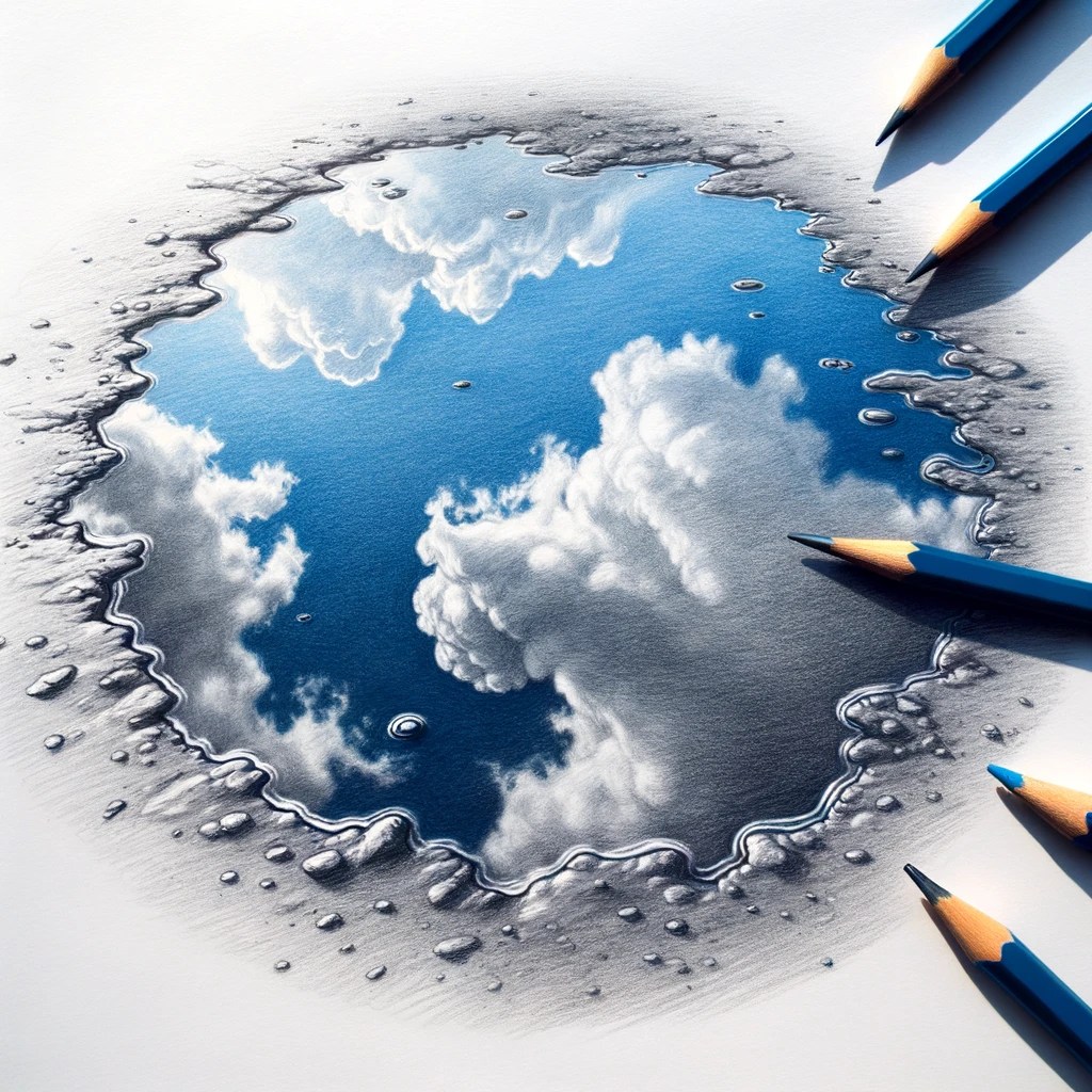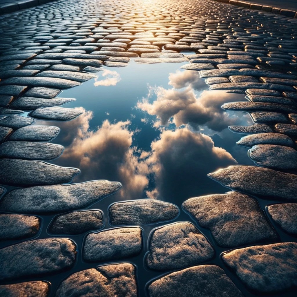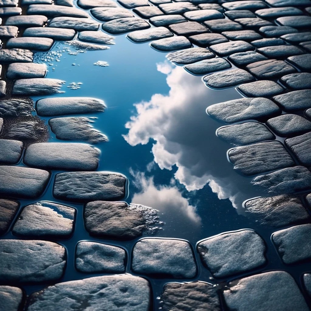 Me: Create a photo of a close-up of a puddle that reflects the clear sky with a few clouds.
