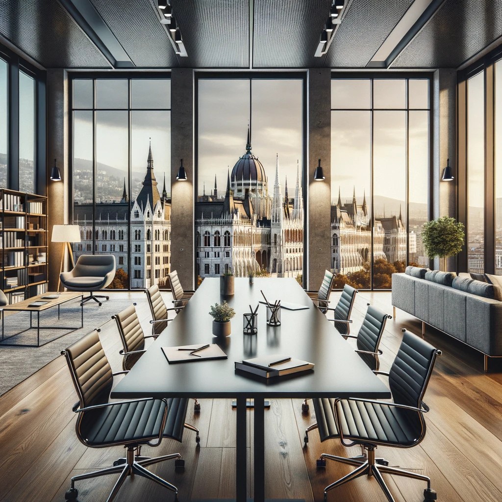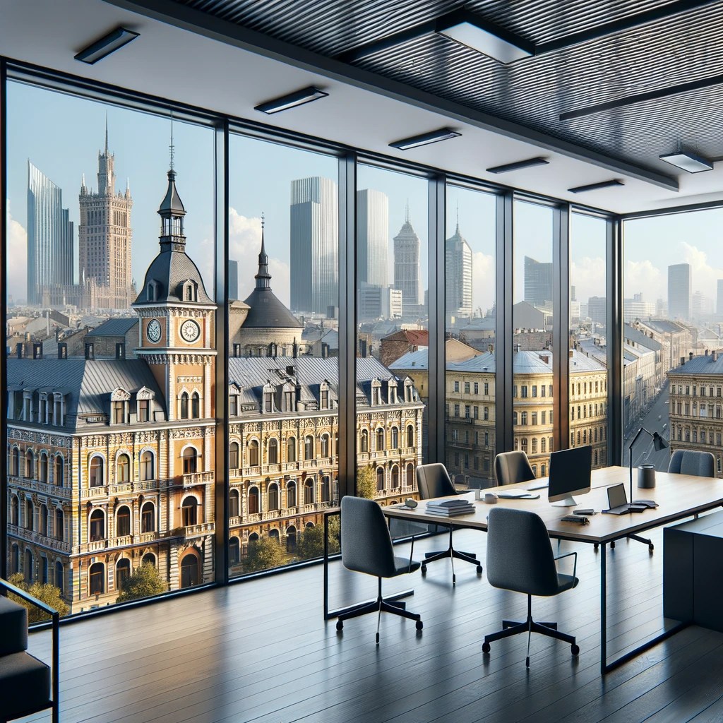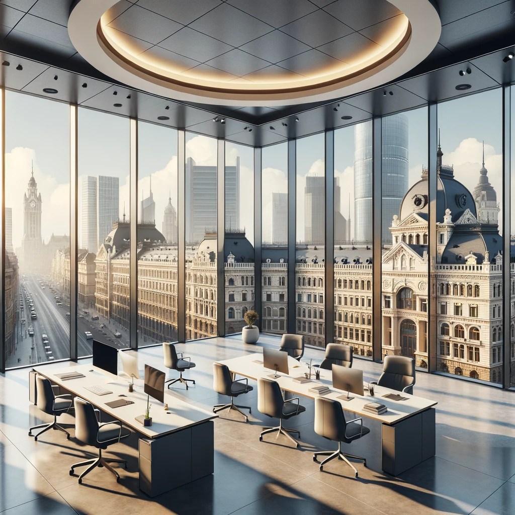 Me: Generate a photo to serve as a video call background, which includes the interior of a modern office with large windows. Through the windows, the skyline of a Central European city is visible, with a mix of 19th century buildings and modern office blocks.