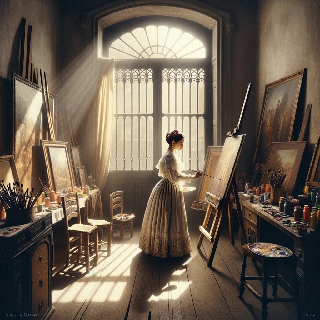 Me: Create a photo of the studio of a painter, in Mexico in the early 20th century. The painter is at work in the middle of the room. The painter is a young woman, in an attire matching early-20th-century Mexico. Light is coming from the right, through a large French window.