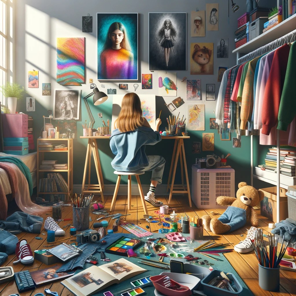 Me: Re-create the image to show a modern teenage girl’s room with a lot of clutter. The painter is a teenage girl.