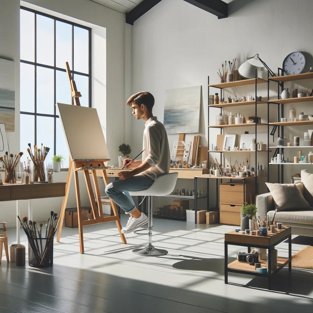 Me: Re-create the image to show the studio of a young professional painter. The studio is very modern and organized.