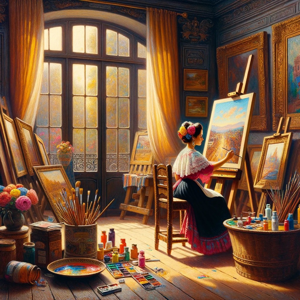 Me: Create a photo of the studio of a painter, in Mexico in the early 20th century. The painter is at work in the middle of the room. The painter is a young woman, in an attire matching early-20th-century Mexico. Light is coming from the right, through a large French window.