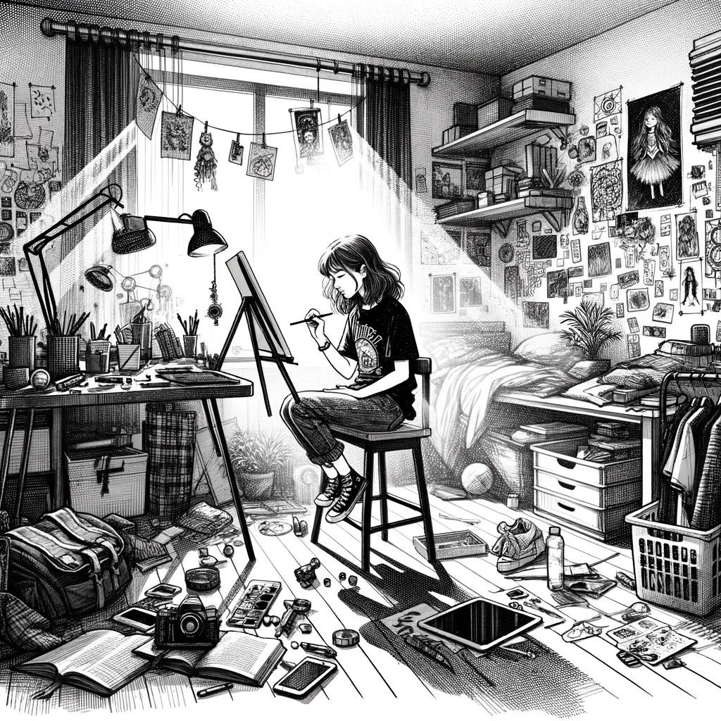 Me: Re-create the image to show a modern teenage girl’s room with a lot of clutter. The painter is a teenage girl.