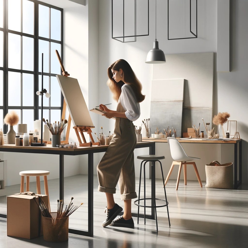 Me: Re-create the image to show the studio of a young professional painter. The studio is very modern and organized.