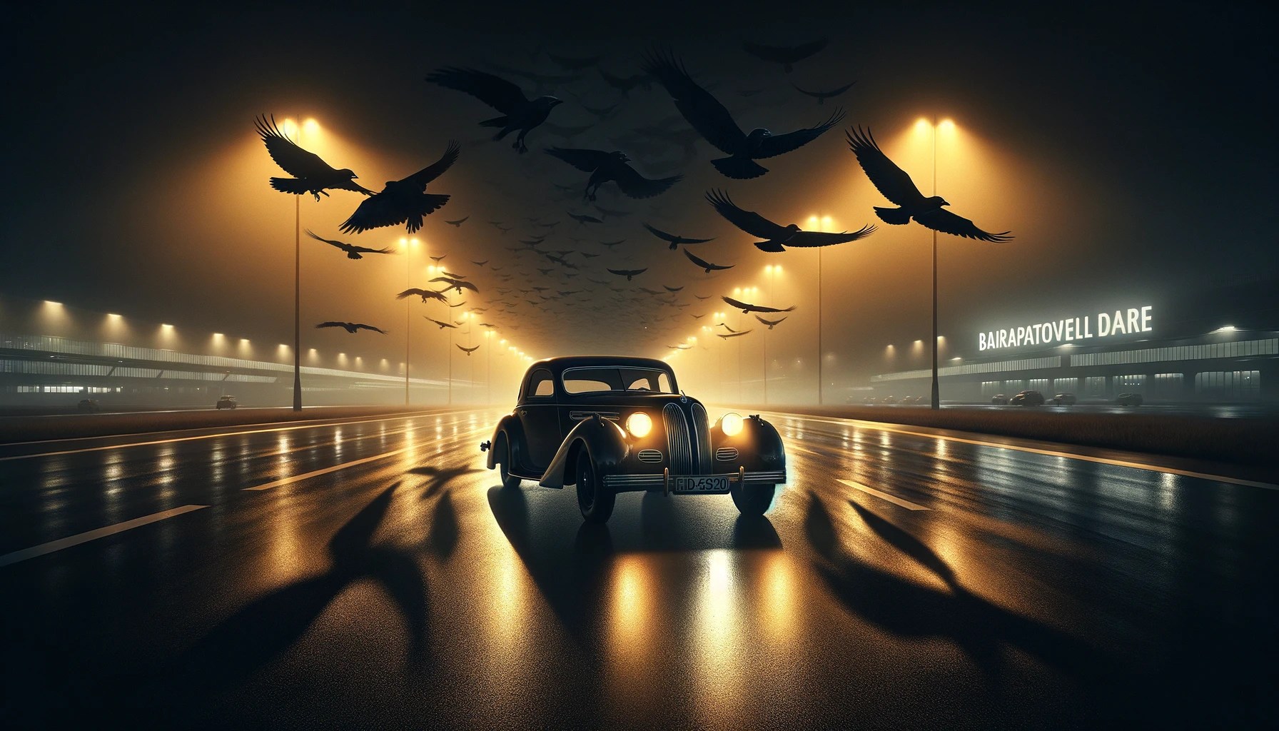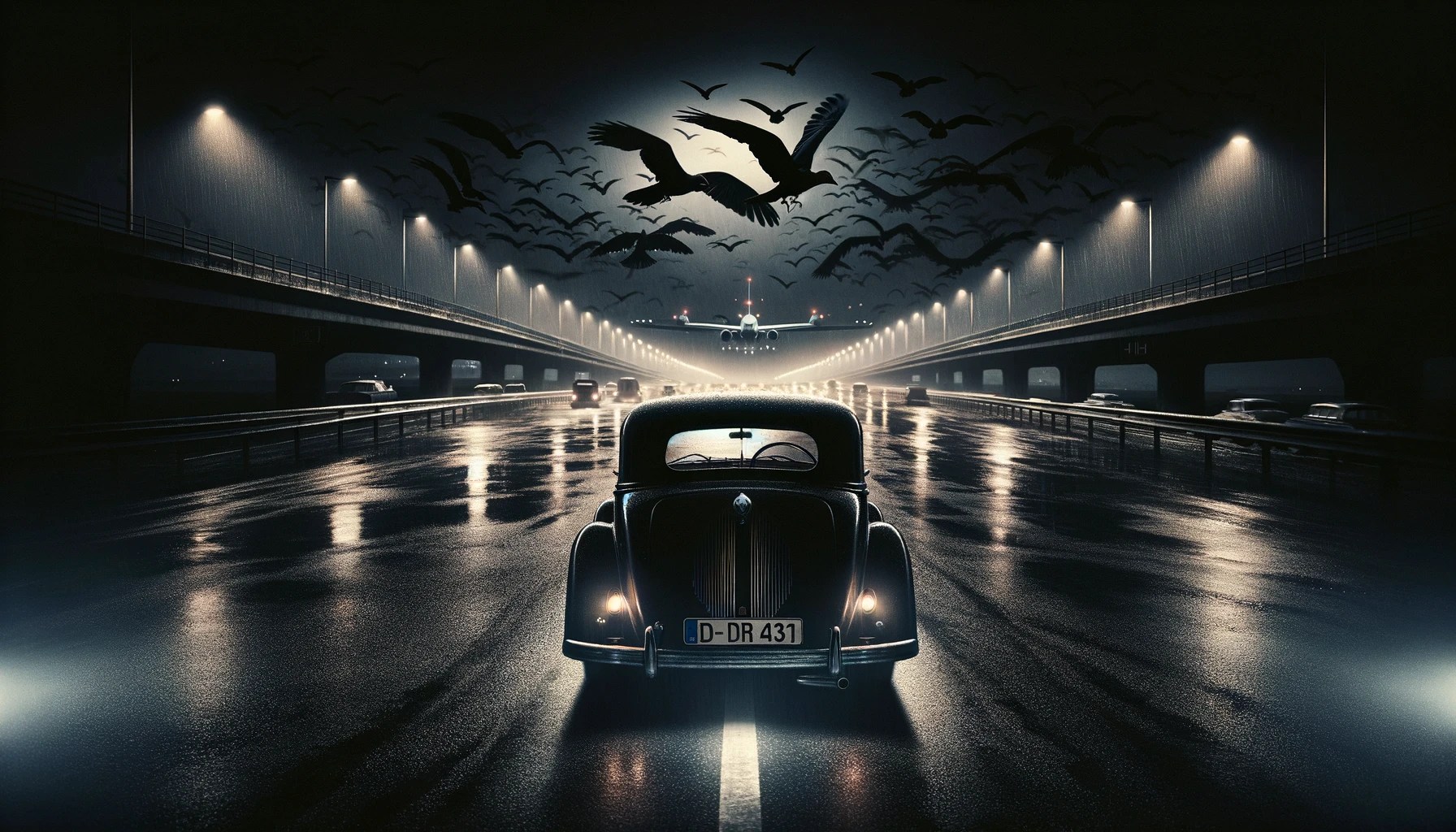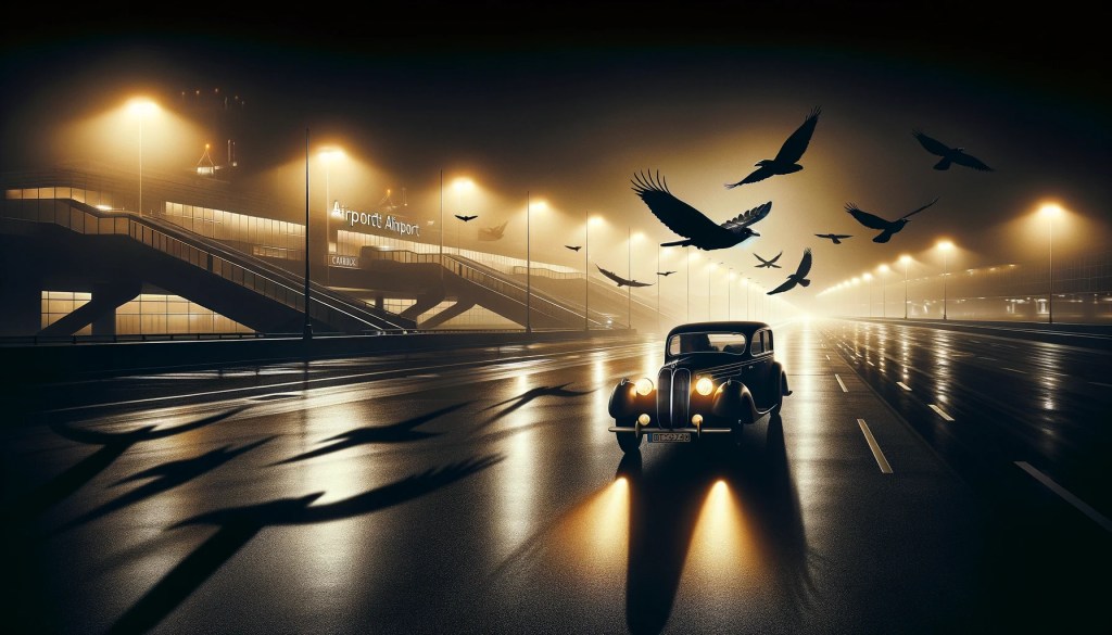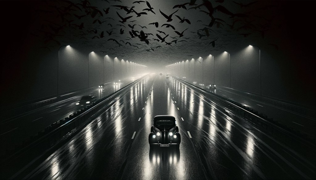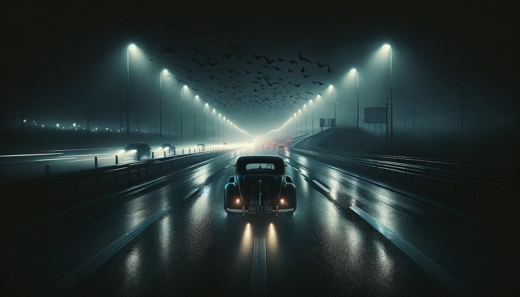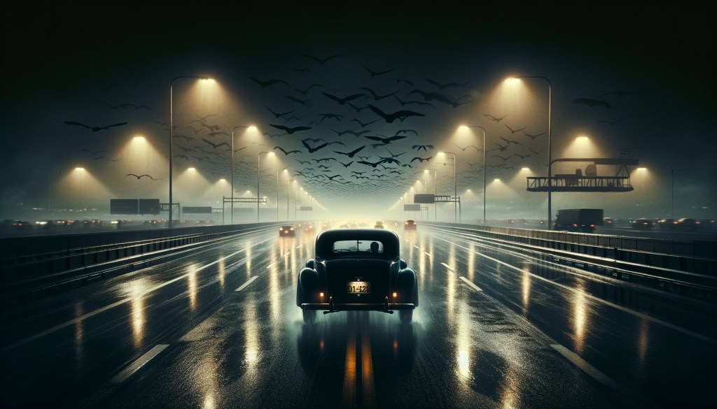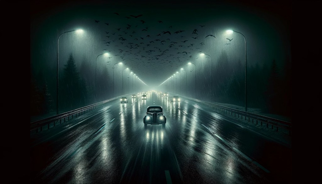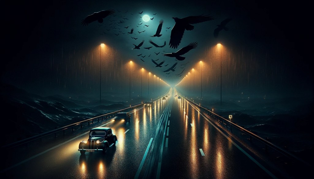 Me: We are driving to the airport on a four-lane road. It’s dark and the road is wet and looks slippery. There are dim and creepy lights along the road but only a few. There is one more car running the opposite direction. It looks like a 1930s BMW, but it’s black and it is barely visible. There are shadows of large crow-like birds flying over the road.
