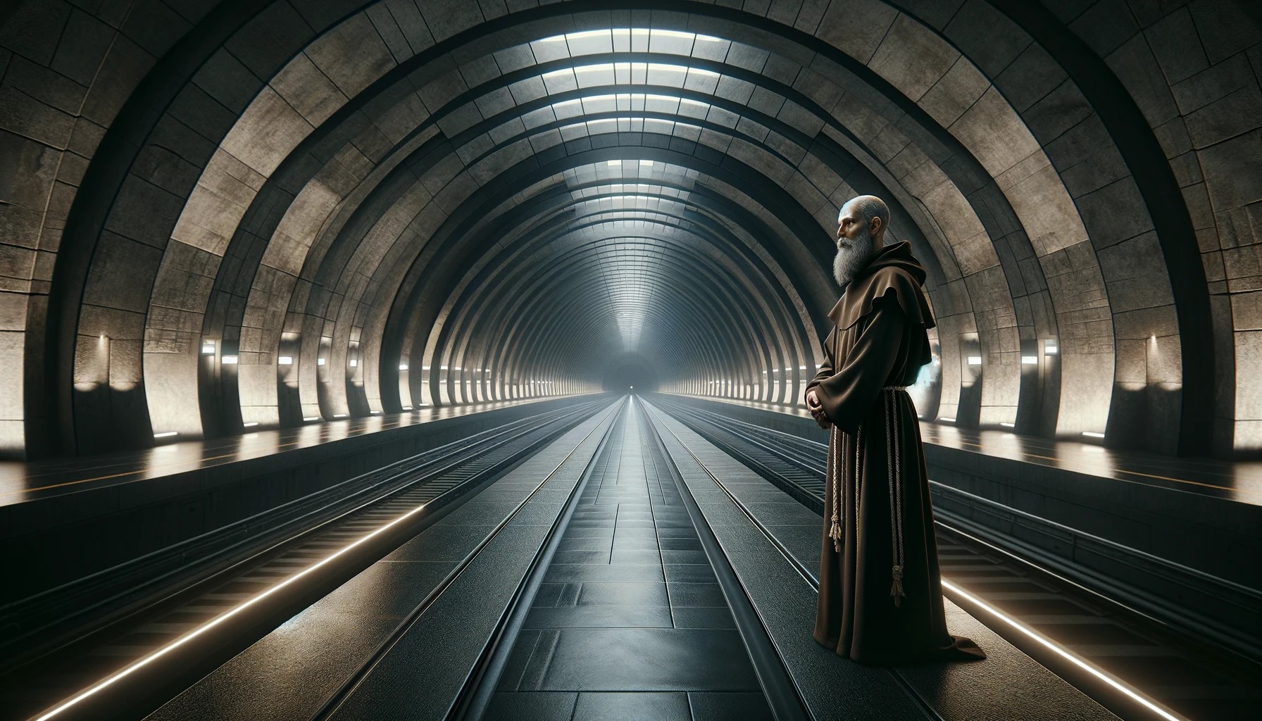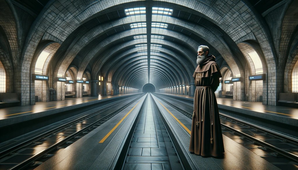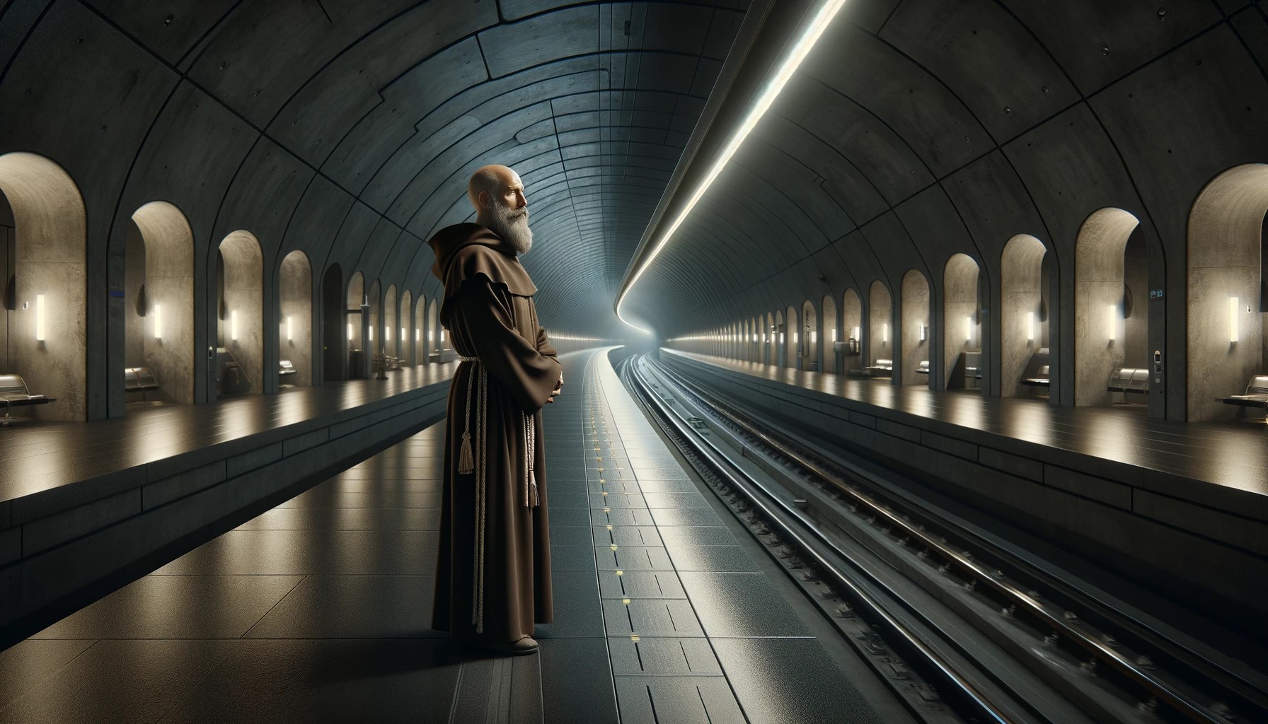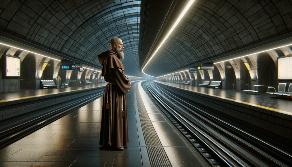 Me: Create a photorealistic image of St Jerome, as a Franciscan monk, waiting for a train in a futuristic train station. The station is underground and completely dark. There are no trains or people.