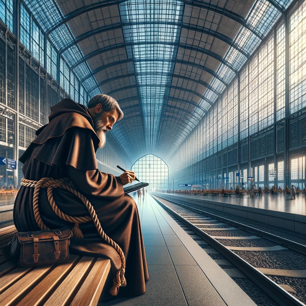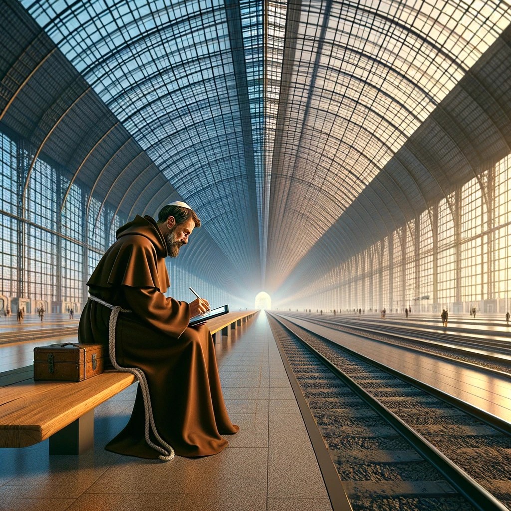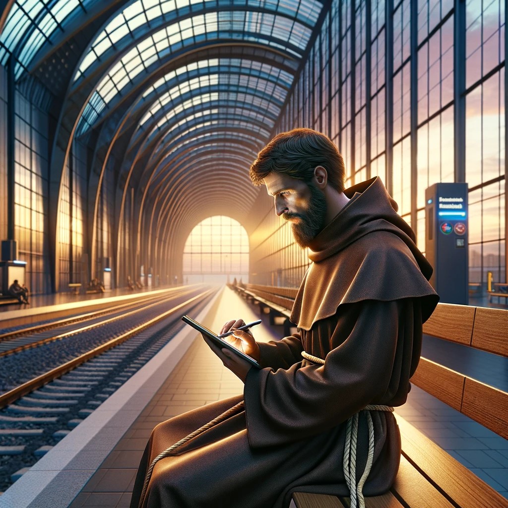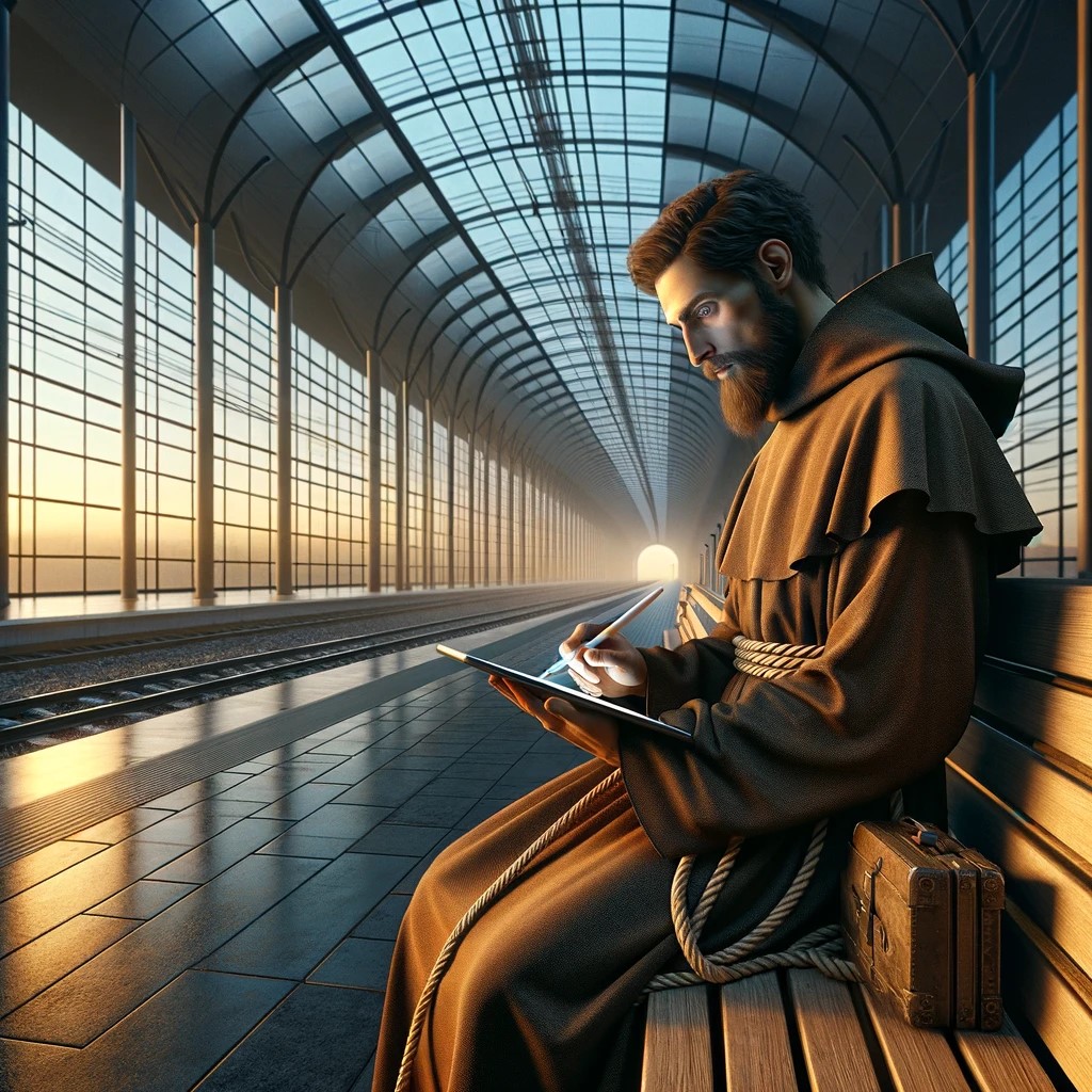 Me: Create a photorealistic image: St Jerome, dressed as a Franciscan monk, sits in an empty railway station. He is holding a tablet (computer), and is editing something on it using a pen. The railway station has glass walls and ceiling. Outside it’s dawn, which makes the inside of the railway station vivid and colorful.