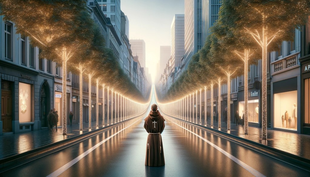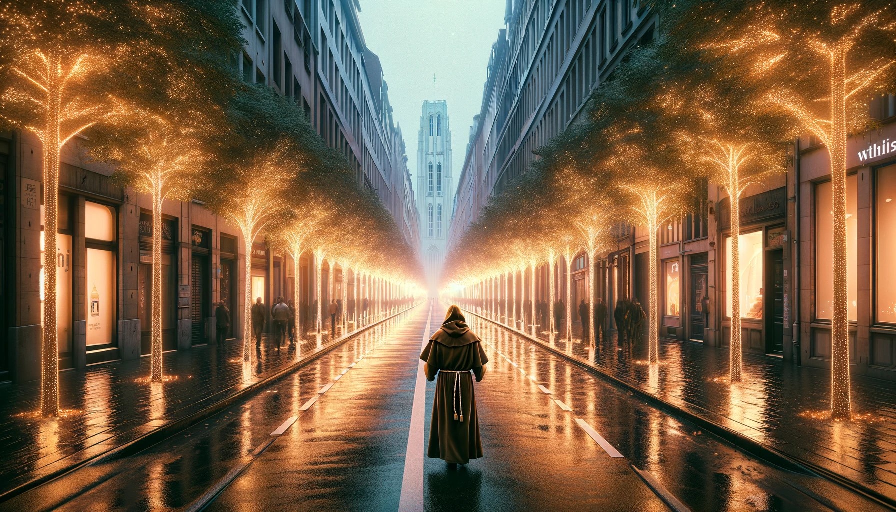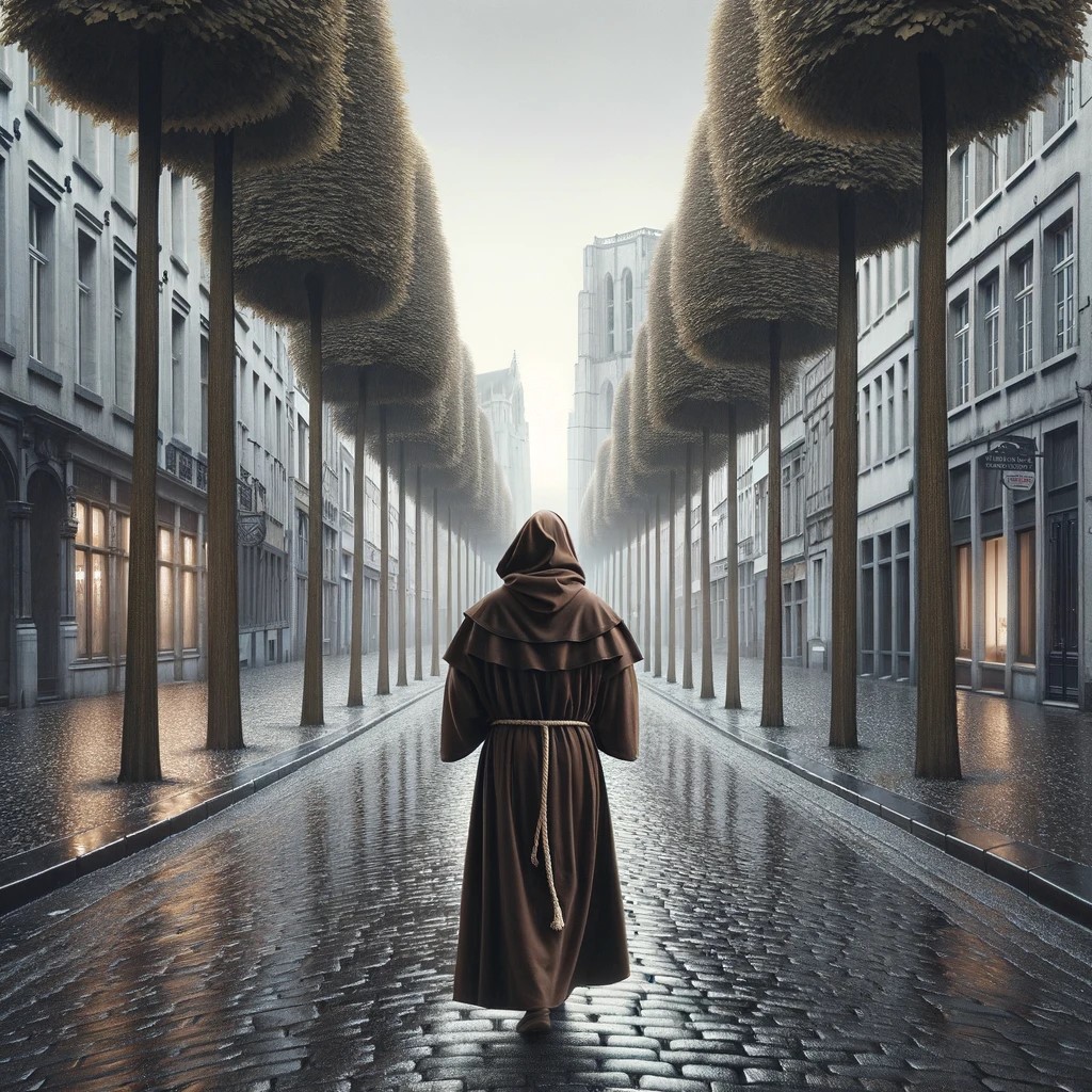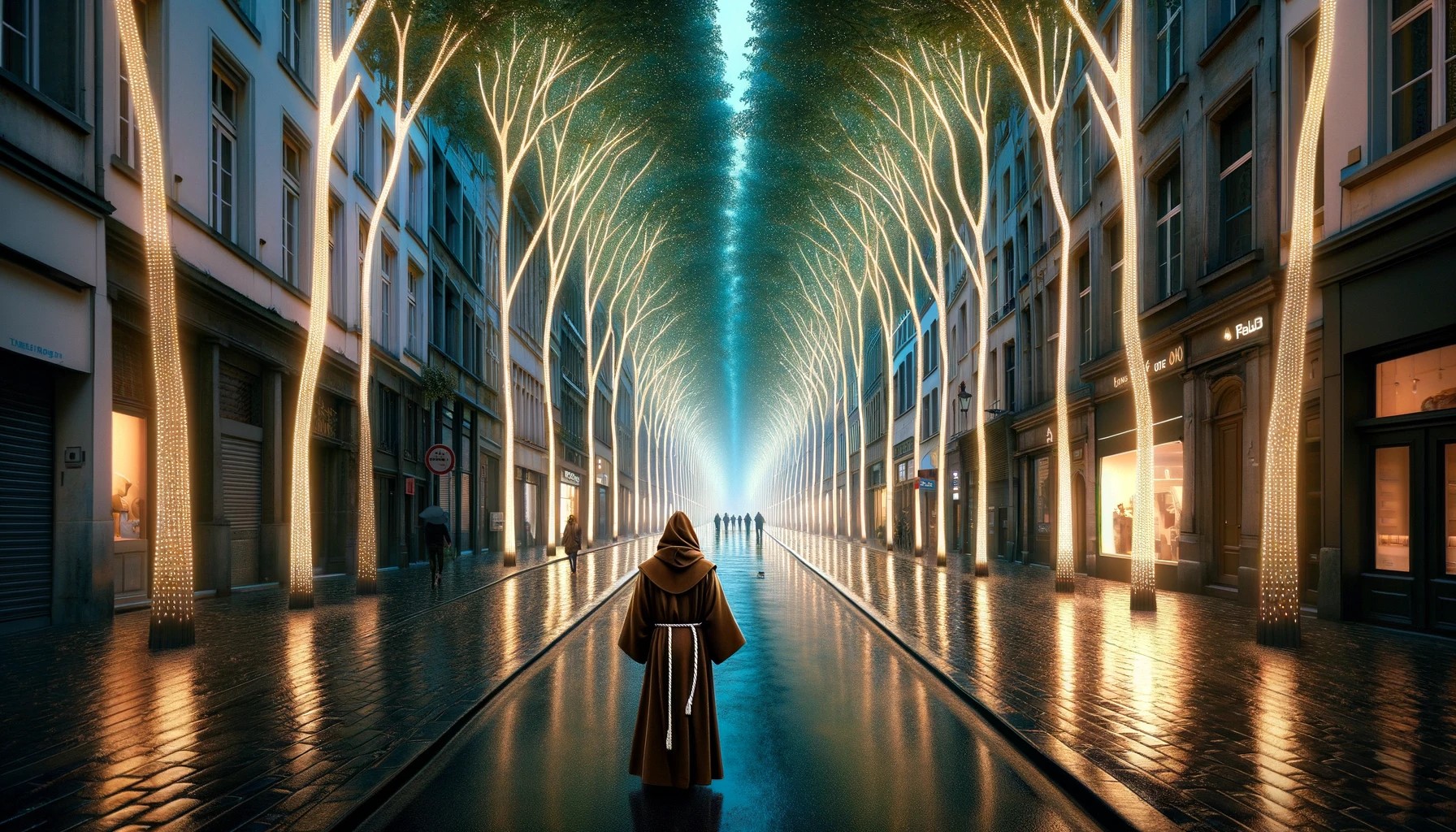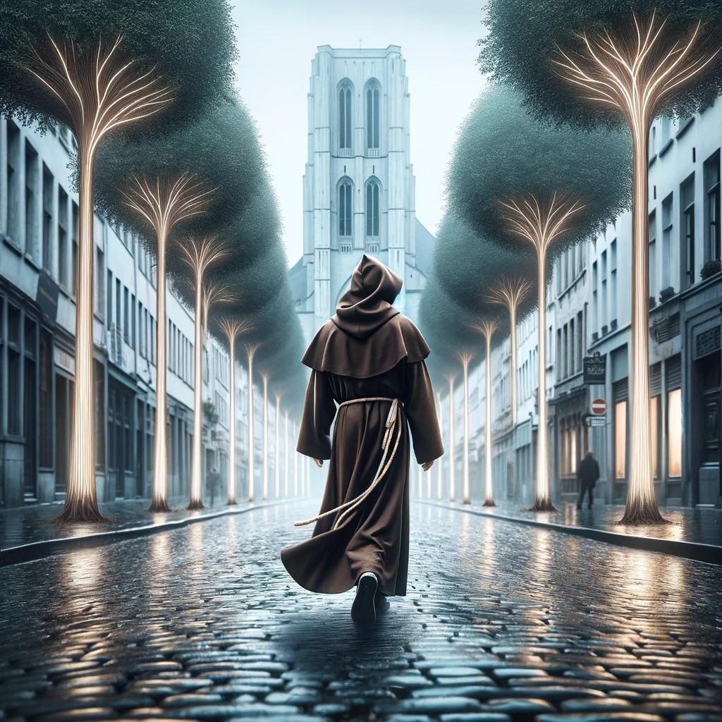 Me: Create a photorealistic image: We are following St Jerome, dressed as a Franciscan monk, down the Rue de la Loi in Brussels He is walking slowly. It’s raining. In the middle of the road, there is a row of strange tall trees, with illuminated leaves.