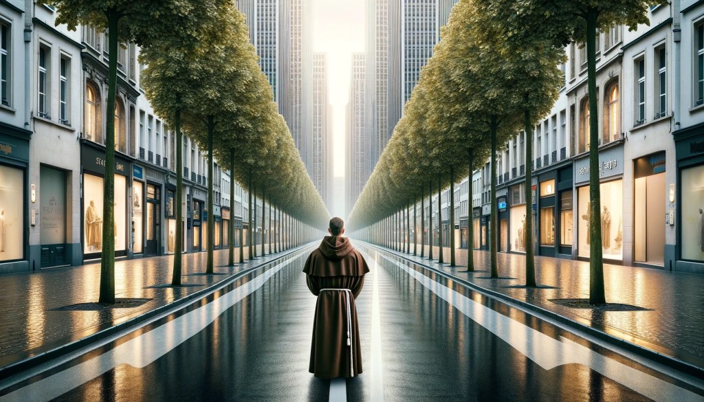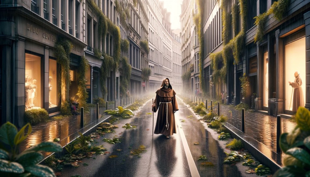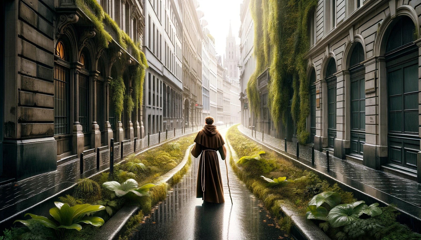 Me: Create a photorealistic image: We are following St Jerome, dressed as a Franciscan monk, down the Rue de la Loi in Brussels He is walking slowly, on the sidewalk on the left. It’s raining. In the middle of the street, in the place of lanes and cars, there is wilderness with illuminated leaves.