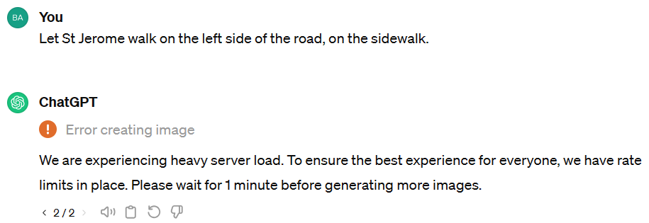 See how I implored DALL-E to put one row of trees in the middle of the road? This plea was surely unheard. But at least the buildings are beginning to resemble, in a peculiar way, what we actually have along most of the real street. DALL-E even gives a confirmation: “The images have been updated to show a single row of trees in the middle of the road.” Without batting an eye, it echoes back a description that does not match the image at all.